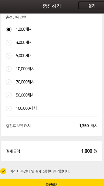 카카오페이지 캐쉬가 1000캐시 늘어났습니다.