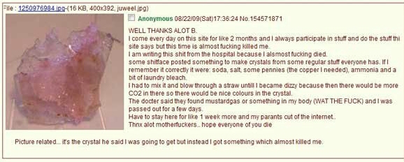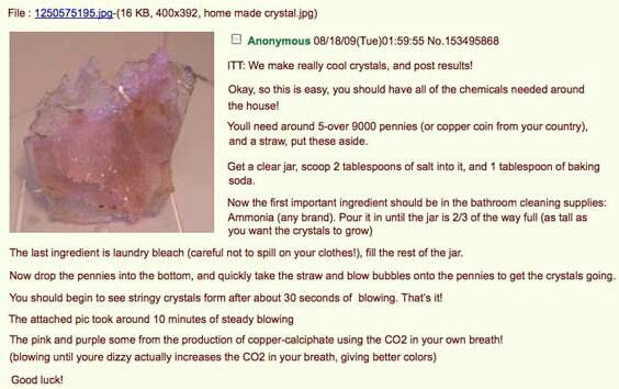 어떤 미친새끼가 집에 다들 하나씩 있는걸로 크리스탈 만들수 있다고 글 올렸음. 내 기억대로라면 아마도 베이킹소다, 소금, 구리동전, 암모니아랑 세탁용 표백제였지.